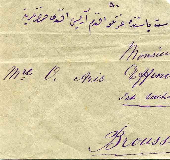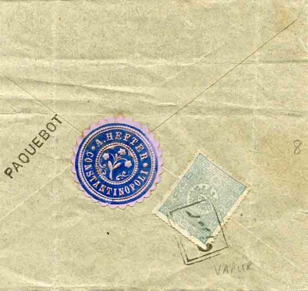Ottoman Turkey: circa 1892 part cover from Istanbul to Bursa franked with 1pi of 1892 coat of arms issue and tied by VAPUR [Ship] (A&P type 3, RR) double box handstamp, straight line PAQUEBOT handstamp and A. HEFTER * CONSTANTINOPOLI label.