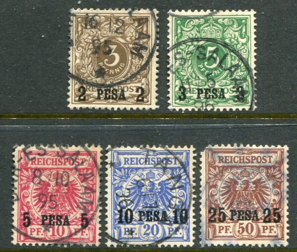 German East Africa: 1893 (1 July). Stamps of Germany surcharged with “PESA” values used basic set. 50pf missing perf. on top left. Most with Dar Es Salaam datestamps. Sg. 1/2, 4/6