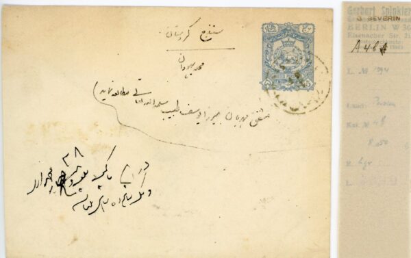 Iran: 1893 coat of arms 5ch (141 x 109 mm) postal stationery envelope from Kermanshah with dealer’s price label.