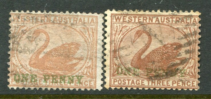 Western Australia: 1893 (February). Swan ONE PENNY surcharged on 3d. cinnamon and 3d. pale brown used. Sg. 108/109