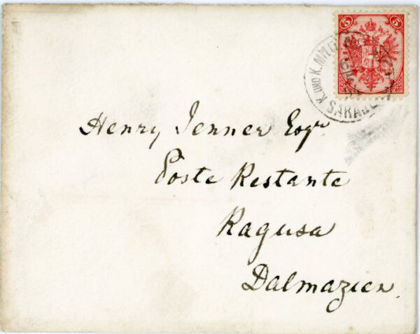 Bosnia: 1894 (6 May). Poste Restante cover with its contents to Croatia franked with 5h perf. 11 1/2 tied by Austrian Military Post Sarajevo datestamp. Reverse 8 May Dubrovnik Ragusa arrival cds.