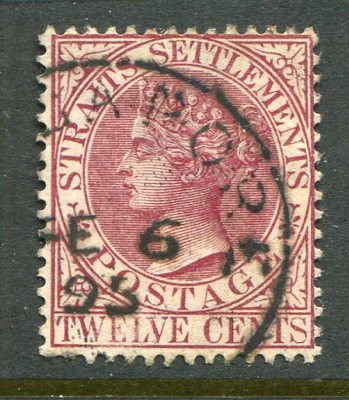 Malaysia – Strait Settlements: 1894 wmk Crown CA 12c. claret struck by part Singapore datestamp. Sg. 102