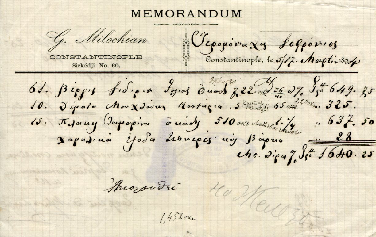 1894 G. Milochian, Constantinople imprinted Memorandum