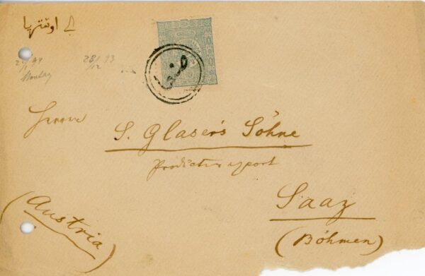 Ottoman Yemen: 1894 (January). Cover to Saaz, Austria franked with 1pi of 1892 coat of arms stamp for one piaster foreign letter rate tied by double circle SAN’A (vilayet Yemen, A&P type 1, YAR #48, R) hand stamp. Reverse 5 January Aden transit and 21 January arrival cds’s. Couple of filing holes but still scarce.