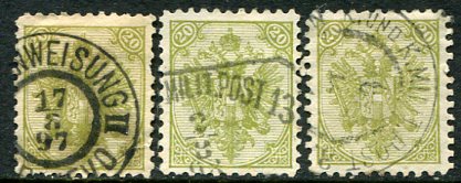 Bosnia- Austria Hungary Military Post: 1895-99 coat of arms 20k yellow-green x 2 and dull green perf. 10 1/2, all struck by part datestamps. Sg. 129,130