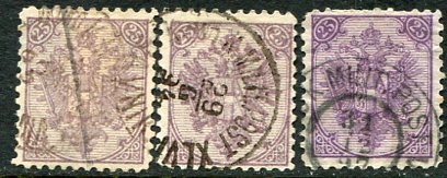 Bosnia- Austria Hungary Military Post: 1895-99 coat of arms 25k reddish purple x 2 and aniline mauve perf. 10 1/2, all struck by part datestamps. Sg. 132, 133
