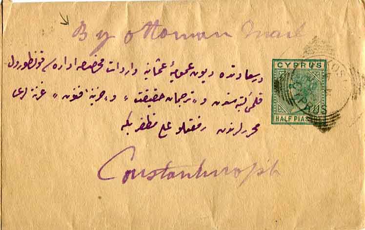 Cyprus: 1895 (4 January). 1/2pi complete Queen Victoria newspaper wrapper to Istanbul struck by Nikosia datestamp and by manuscript “By Ottoman Mail”. Reverse 21 January arrival cds. Very rare.