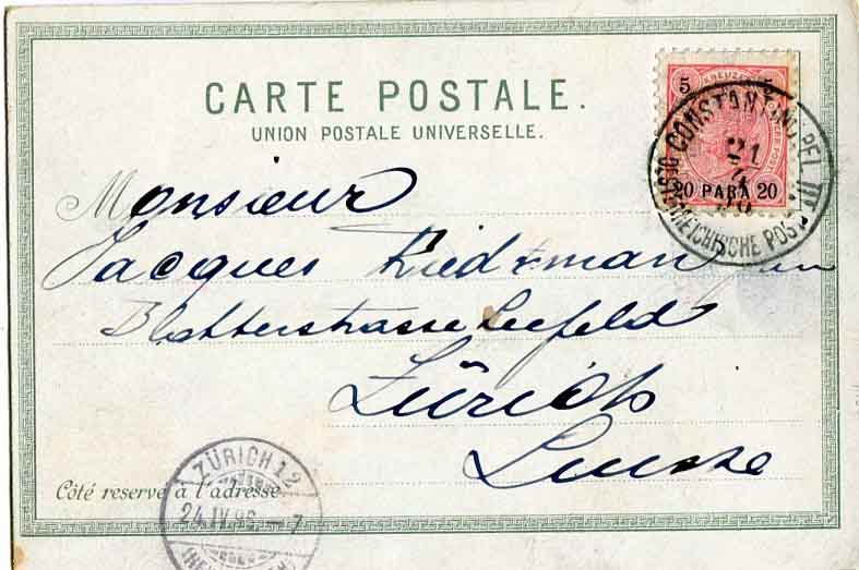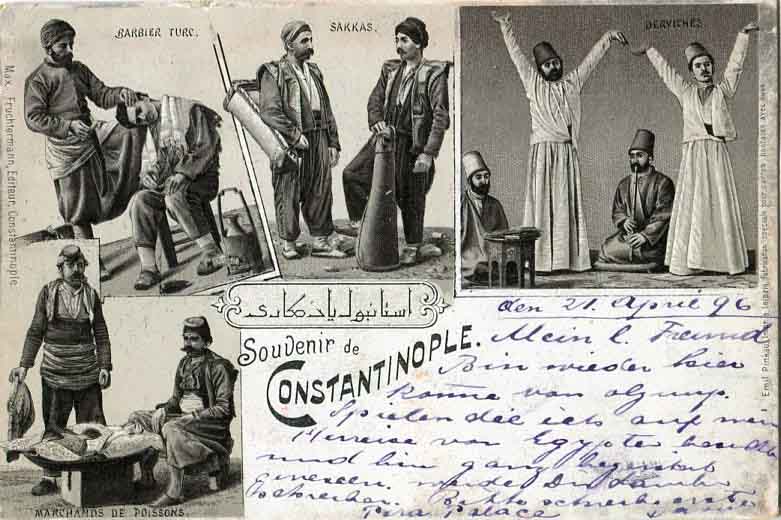 Austria Levant: 1896 (21 April). Litho postcard (ed. Max Fruchtermann) showing whirling Dervishes, Barber, Water seller and Shoe Maker to Switzerland franked with 20pa on 5k Austrian Levant stamp tied by Constantinopel III dispatch and 24 April Zurich arrival cds’s.