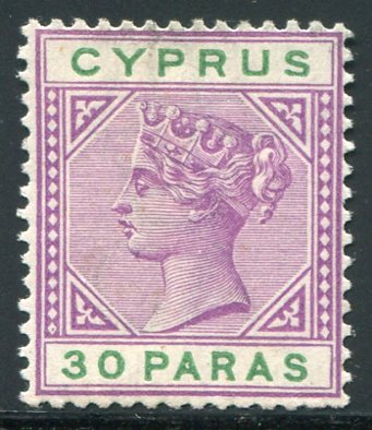 Cyprus: 1896. Queen Victoria head die II wmk Crown CA 30pa mint o.g. with “US” damaged at foot (Row 5/5 of both panes) error. Sg. 41a