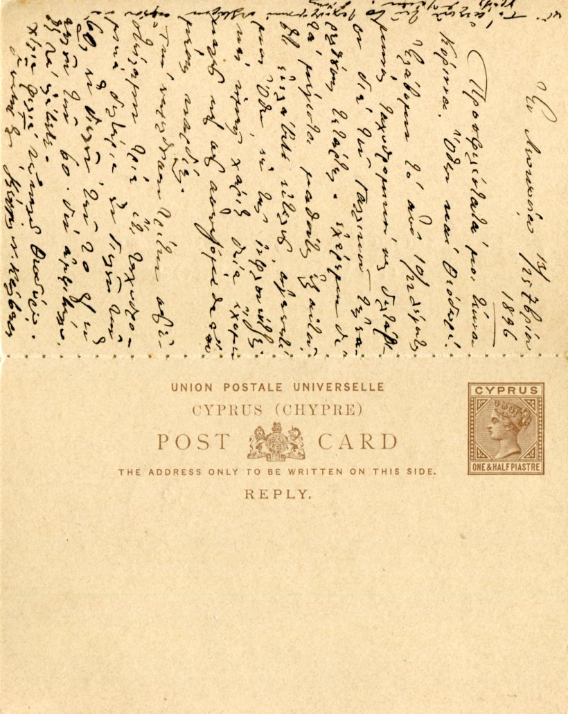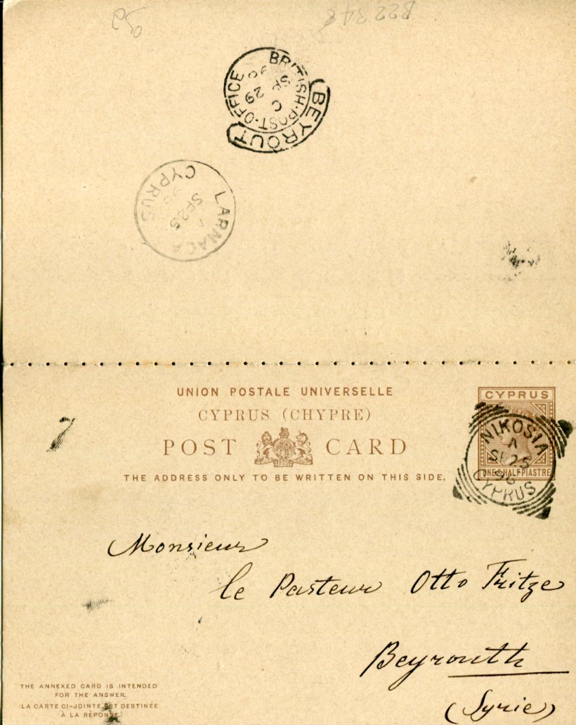 Cyprus: 1896 (25 September). QV 1 1/2pi Reply Paid postal stationery card with flattened first ‘D’ of word ‘INTENDED’ variety to Beirut struck by Nikosia datestamp. Reverse same day Larnaca transit and 29 September BPO Beyrouth hooded arrival cds’s. I&P 9b