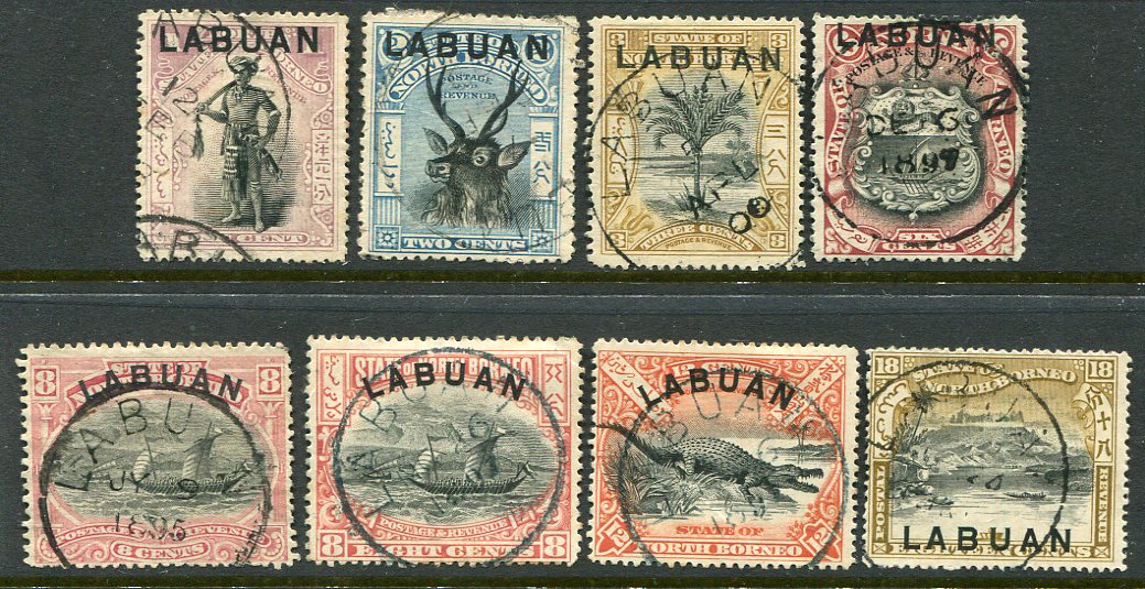 Labuan: 1896 North Borneo stamps overprinted LABUAN used values to 18c. perf. 16 olive-bistre. 8c both colours rose-red and vermillion. Sg. 89/96 (between)
