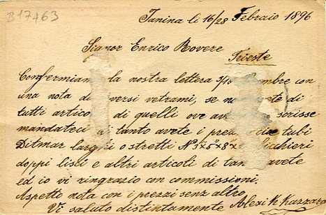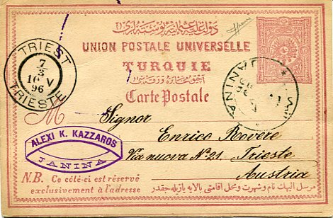 Ottoman Greece: 1896 (28 February). 20pa postal stationery card to Italy struck by YANYA – JANINA (A&P type 7, R) datestamp, ALEXI K. KAZZAROS merchant cachet and 7 March Trieste arrival cds.