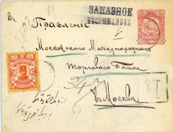 Iran: 1896 coat of arms 16ch postal stationery envelope (141 x 109 mm) registered to Russia uprated with 1Kr. Nassereddin Shah Qajar Golden Jubilee stamp tied by illegible datestamp. Reverse 2 November Moscow arrival cds’s. Cover flap missing but still very scarce.
