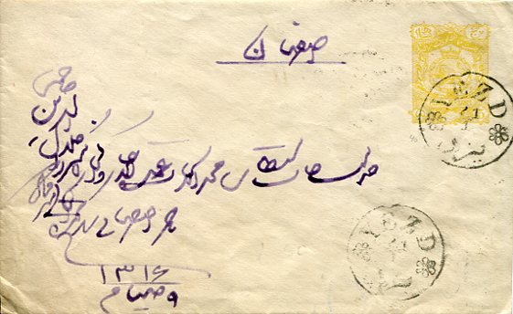 Iran: 1896 (21 January). 5ch coat of arms (150x91mm) postal stationery envelope to Isfahan struck by YEZD datestamps. Reverse no postal markings.
