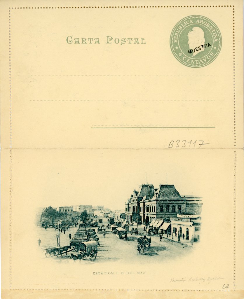 Argentina: 1897 MUESTRA (Specimen) handstamped 4c. Illustrated Lettercard titled ‘Estacion F.C. Del Sud’.