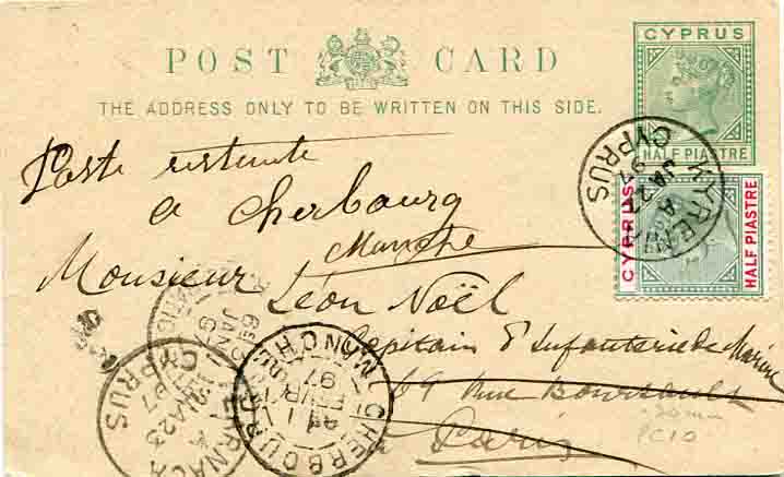 Cyprus: 1897 (22 Jan). 1/2pi inland postal stationery card (I&P PC10) to Paris uprated with 1/2pi (SG 40) tied by KYRENIA ‘A’ date stamp alongside next day Larnaca cds, redirected to Cherbourg with 31 Oct and 1 Feb cds’s.