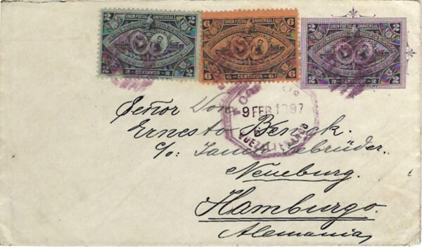Guatemala: 1897 (9 Feb) 2c postal stationery envelope of Central American Exposition uprated with same issue 2c and 6c to Hamburg tied violet bars and a Quezaltemango octagonal date stamp, arrival backstamp.