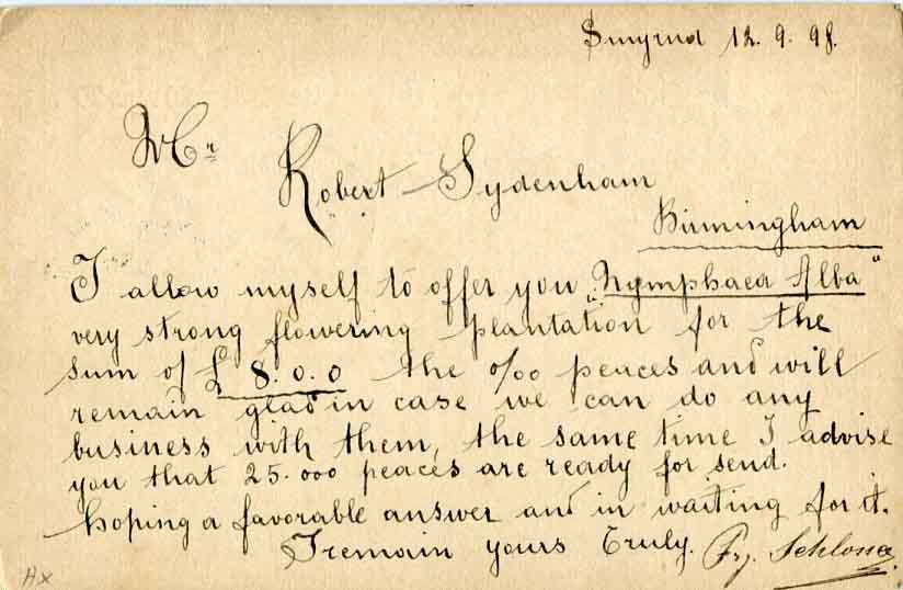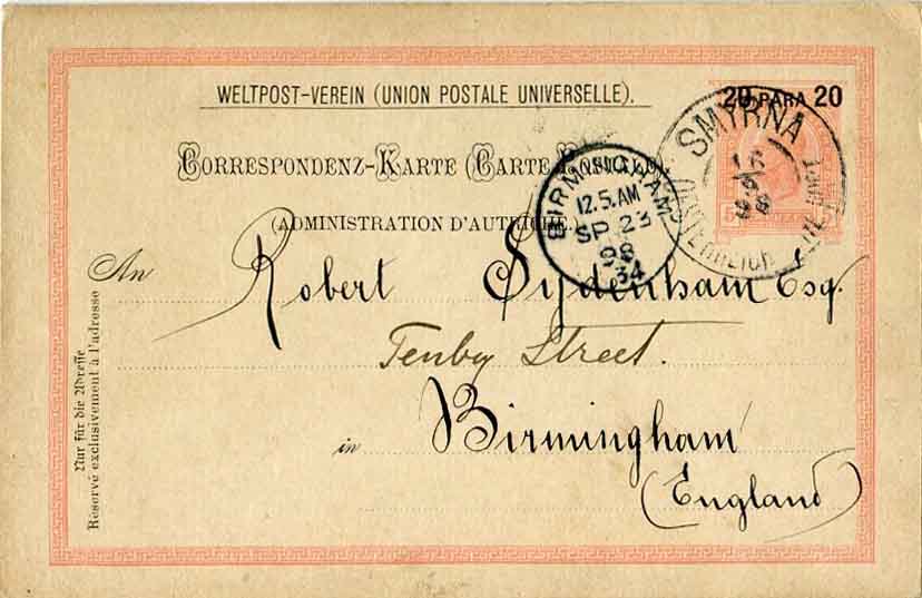 Austria Levant: 1898 20pa surcharged on 5k postal stationery card to England struck by SMYRNA Oesterreich Post datestamp and 23 September Birmingham arrival cds.