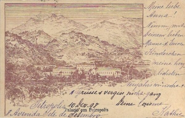 Brazil: 1898 “Palacio em Petropolis” picture postcard, undivided back, used from Petropolis to Wusterwitz Kreis Schlawe, Germany bearing single franking 100r tied despatch cds, two rio transits, Crangen and arrival cds.