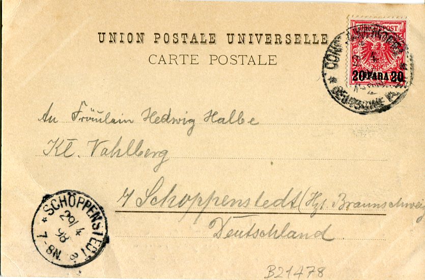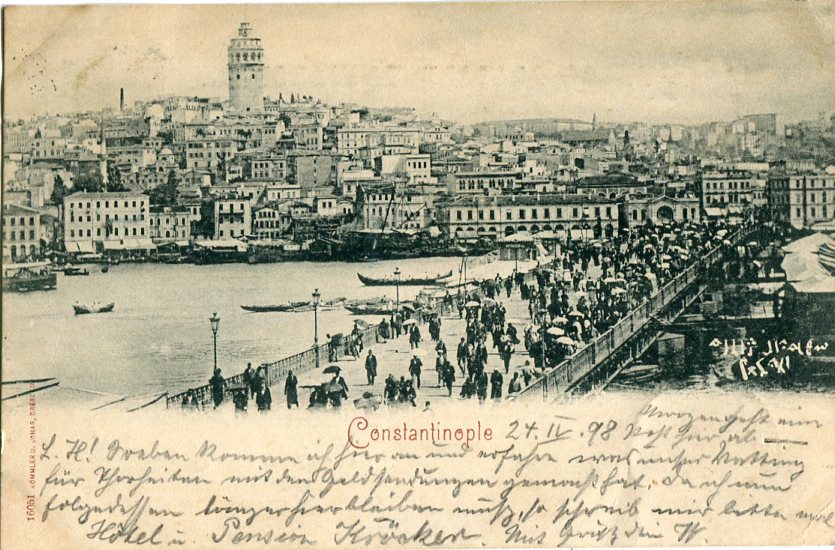 German Levant – Turkey: 1898 (24 April). Postcard of ‘Constantinople – Galata Bridge’ to Germany franked with 20pa Turkish currency surcharged 10pf Reichpost stamp tied by Constantinopel * Deutsche Post datestamp and 29 April Schoppenstedt arrival cds. ed. Rommler U. Jonas