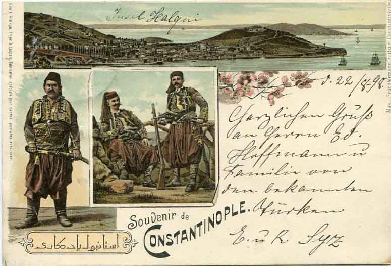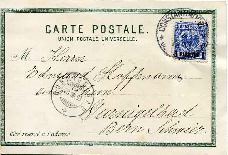 German Levant: 1898 (24 August). Picture postcard of Constantinople (ed. Max Fruchtermann) to Switzerland franked with 1pi surcharged on 20pf ultramarine (Sg. 12) tied by Deutsche Post Constantinopel atestamp and 28 August Gurnigelbad arrival cds.