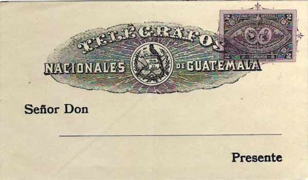 Guatemala: 1898 2c Central American Exposition ‘Telegrafos’ overprinted envelope unused without name or address; central vertical crease, scarce unused.