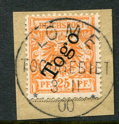 German Colonies – Togo: 1898 “Togo” overprinted 25pf German stamp on piece struck by superb LOME 3 II 00 datestamp. Sg. G5