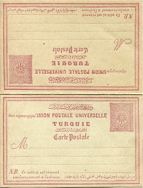 Ottoman Empire: 1898 coat of arms 20pa greenish grey reply postal stationery card. Isfila AN38