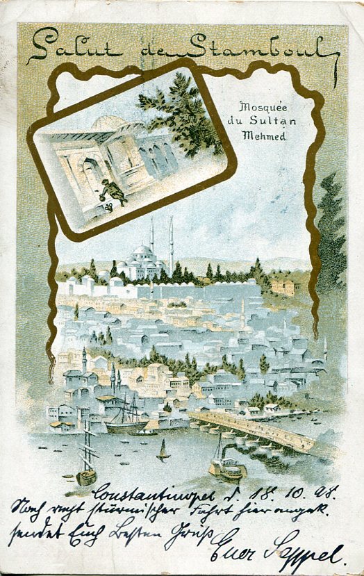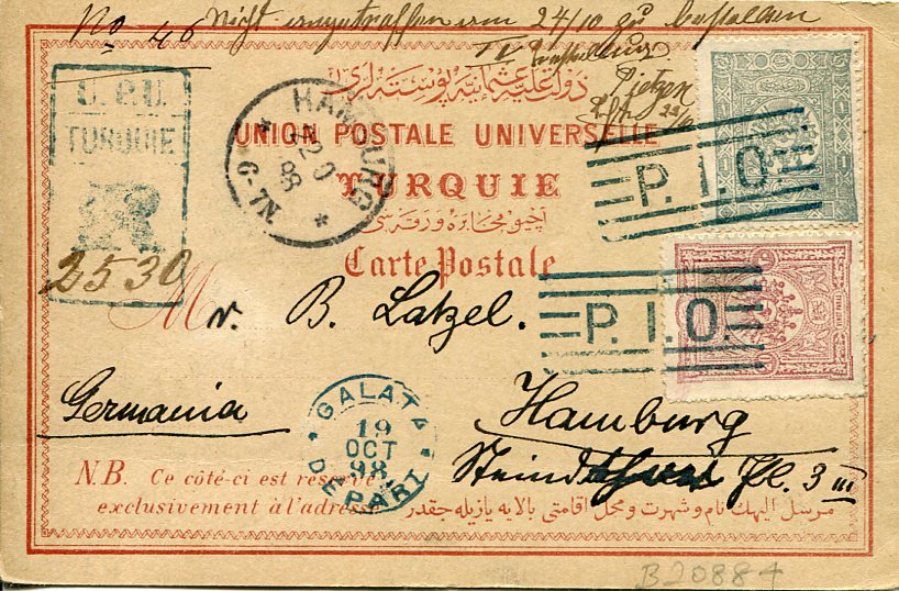 Ottoman Turkey: 1898 (19 October). Registered UPU postcard titled ‘Salut de Stamboul – Mosquee du Sultan Mehmed’ to Germany franked with 20pa and 1pi of 1892 coat of arms stamps for twenty paras postage and one piastre registration rate tied by P.I.O. (Poste Imperiale Ottomane) handstamps, Galata Depart datestamp and 22 October October Hamburg arrival cds.