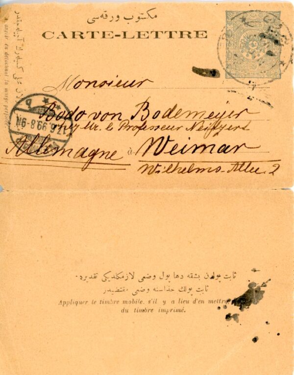 Ottoman Lebanon: 1899 (June). 1pi lettercard to Germany struck by Beyrut – Beyrouth bi-lingual datestamp and 17 June Weimar arrival cds.
