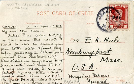 Greece – Crete: 1900 (12 May). Postcard titled Knossos (Candia, Crete) (ed. Behaeddin #139) to United States franked with 10l and tied by Heraklion datestamp.