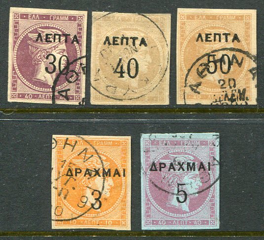 Greece: 1900 (October). Athens print imperf. large Hermes head surcharged used set. Sg. 130/134, Hellas 155/159.