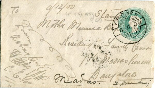 India Used Abroad: 1900 (4 December). C.E.F. overprinted 1/2an postal stationery cover to India tied by Field Post Office No. 9 datestamp where located in Yangchun, China at that time. Reverse 5 December Base Post Office and 4 January 1901 Tuticorin transit and 7 January Bangalore arrival cds’s. Forwarded by manuscript to Madras (now Chennai). It is the scarcest of the British Field Post Office cancellation during Boxer Rebellion in China.