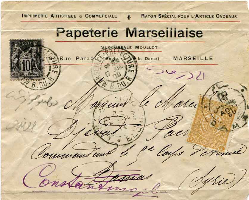 Ottoman Syria: 1900 (17 July). Commercial cover from Marseilles to Istanbul franked with 10c and tied by dispatch and 8 August Bechik-Tache (Besiktas, Istanbul) arrival cds’s. Cover forwarded to Damascus where franked with double rate of 2pi of 1892 coat of arms issue as postage due and tied by DAMAS bi-lingual 30 August arrival cds.