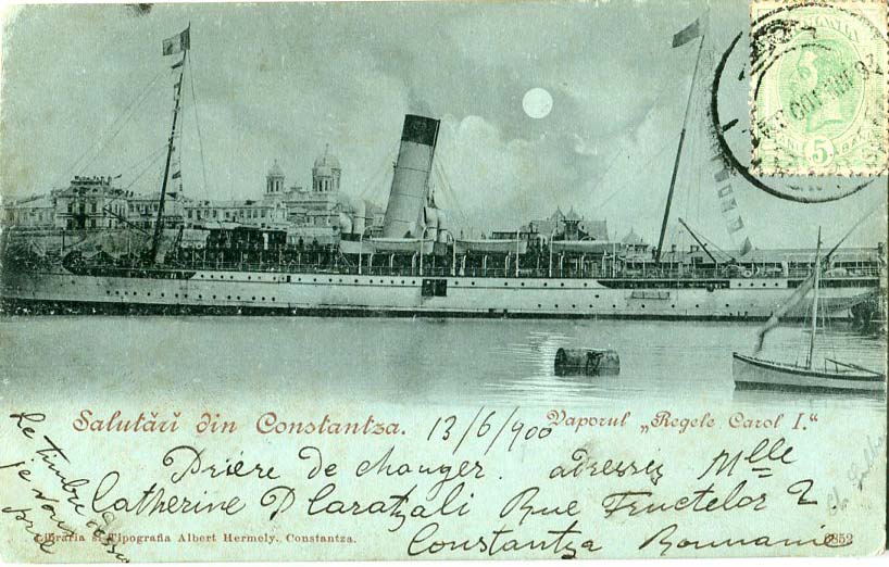 Romania: 1900 (26 June). Postcard titled ‘Vaporul Regele Carol I’ (ed. Albert Hermely) to France franked with 5b and tied by CONSTANTA datestamps and 30 June Sevres arrival cds.