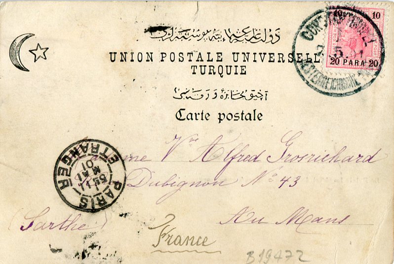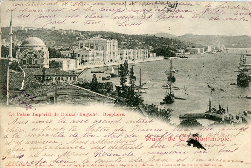 Austrian Levant: 1901 (7 May). Postcard titled ‘ Le Palais Imperial de Dolma-Baghtce Bosphore’ to France franked with 20pa Turkish currency surcharged 10h Austrian stamp tied by Constantinopel 1 datestamp and 11 May Paris arrival cds.