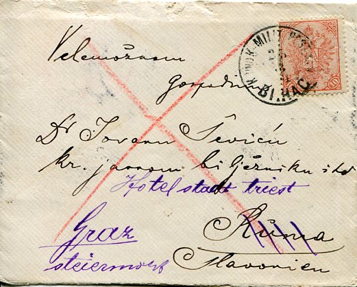 Bosnia and Herzegovina: 1901 (25 August). Cover to Austria franked with 10h perf. 12 1/2 tied by Austrian Military Post BIHAC datestamp. Cover re-directed to Graz with Ruma and 27 August Graz arrival cds’s.