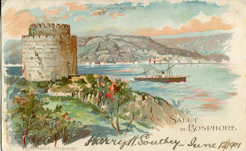 British Levant: 1901 (12 July). Postcard titled ‘Constantinople. Roumelie – Hissar’ (ed. Fruchtermann #236) to Cardiff franked with 1/2d deep green of 1880 Great Britain stamp tied by BPO Constantinople datestamp. Sg. Z124