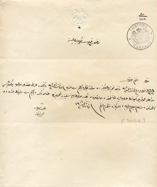 1901 Cyprus Karpas Customs Ottoman Turkish doc