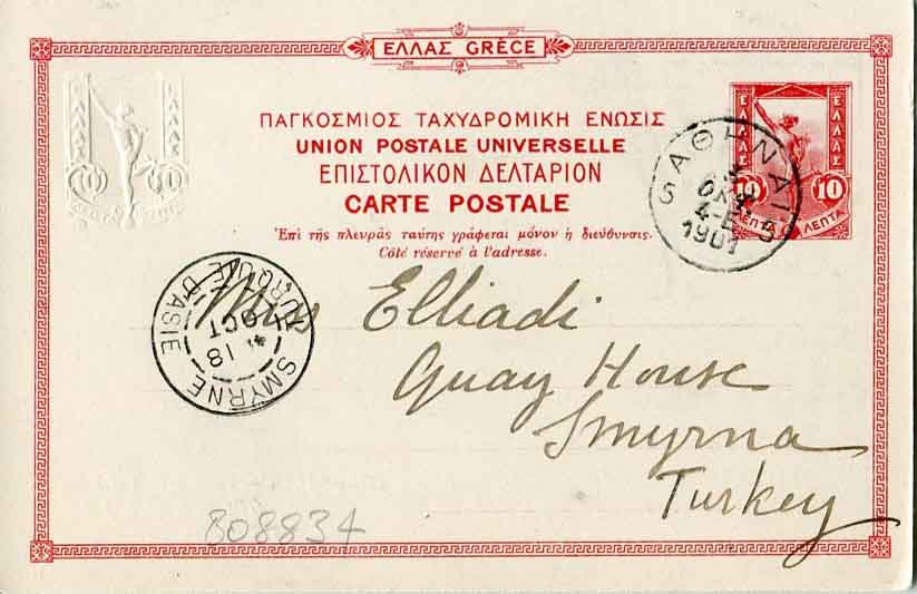 Greece: 1901 (3 October). 10f picture postal stationery card of Larissa, Thessaly from Athens to Smyrna, Turkey tied by dispatch and 18 October Smyrne arrival cds’s. Greek PTT edition # 74