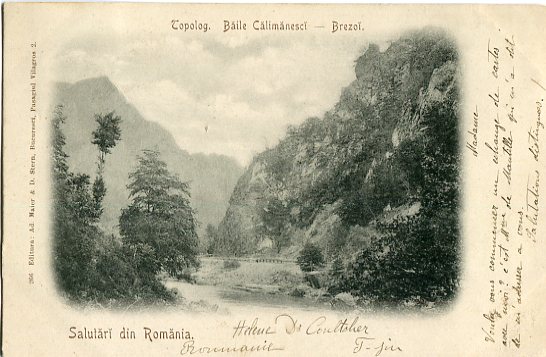 Romania: 1901 (4 April). Postcard titled ‘Topolog. Baile Calimanesci – Brezoi’ (ed. Maier & Stern #266) to France franked with two 5b and tied by TERGU JIU datestamps and 8 April Grazze arrival cds.