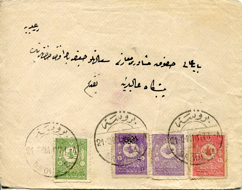 Ottoman Turkey: 1901 (21 December). Cover to Istanbul franked with 5pa, 10pa and 20pa and 5pa printed matter overprinted of 1901 internal use stamps for one piastre letter rate tied by Bursa-Brousse bilingual datestamps. Reverse next day arrival cds’s. Usage of printed matter stamps as postage is uncommon.