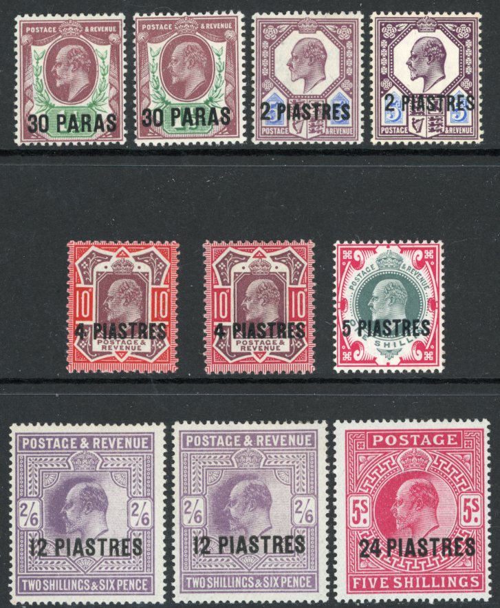 British Levant: 1911-13 KEVII stamps surcharged in Turkish currency mint o.g. set with additional colour varieties of 30pa. on 1 1/2d., 2pi. on 5d., 4pi. on 10d. (dull reddish purple and carmine) and 12pi. on 2s.6d. Sg. 29/34, 29a, 30a, 31a, 33a. *