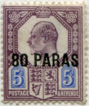 British Levant: 1902 (5 June). KEVII 5d slate purple/ultramarine surcharged 80pa Turkish Currency, unused. Sg. 9 (*)