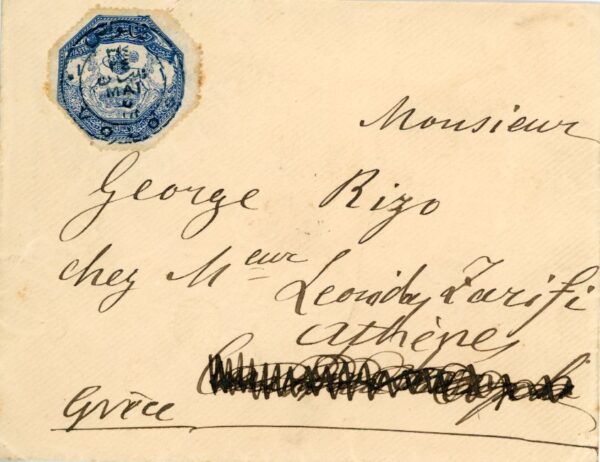 Greece Ottoman Post Offices: 1898 cover to Athens franked with 1pi of 1898 Thessaly Military Post octagonal stamp tied by GOLOS – VOLOS (vilayet Janina, GR #129, RR) datestamp and arrival cds on reverse. Cancellation does not tie to the cover.