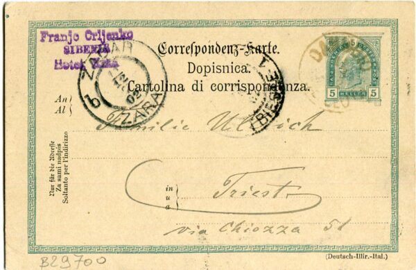 Croatia – Austria: 1902 (11 December). Austrian 5h postal stationery card to Trieste struck by DANUBIO OE. LLOYD (Tch. 157) datestamp, Zara transit and arrival cds’s as well as Sibenik Hotel hand cachet