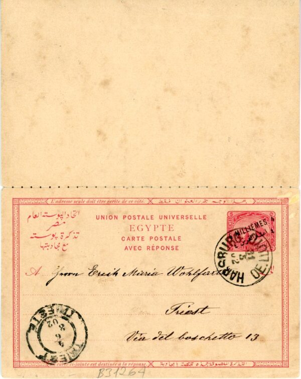 Egypt: 1902 (31 May). 4m surcharged on 3m reply postal stationery card to Trieste struck by HABSBURG OE. LLOYD datestamp and 4 June arrival cds.