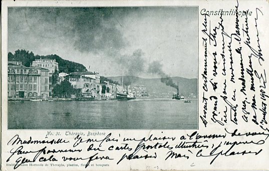 Ottoman Turkey / French Levant: 1902 (5 July). Postcard titled ‘Costantinople. Therapia, Bosphore’ (ed. Horticole de Therapia #31) to France franked with pair of 10pa of 1901 external use issue tied by CONSTANTINOPLE – GALATA * POSTE . FRANC.SE datestamp, oval BM (Boite Mobile) and triangular ‘T’ postage due handcachets. Scarce and unusual usage of French Post Office cancellation on Ottoman stamps.