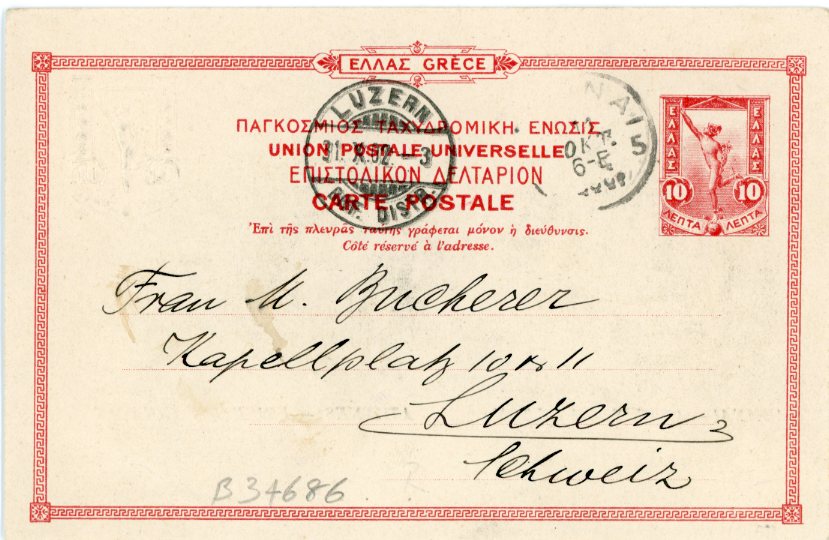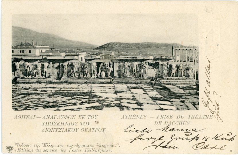 Greece: 1902 Dionysus Theatre reliefs 10l. embossed 10l. picture stationery card #9 from Athens to Luzern, Switzerland.