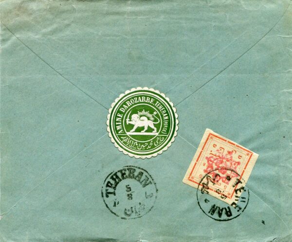 Iran: 1902 (5 August). Commercial cover with its contents to Isfahan franked with 5ch Teheran Typeset issue and tied by dispatch datestamps and ‘Amine Darozarbe Teheran (Perse)’ label.